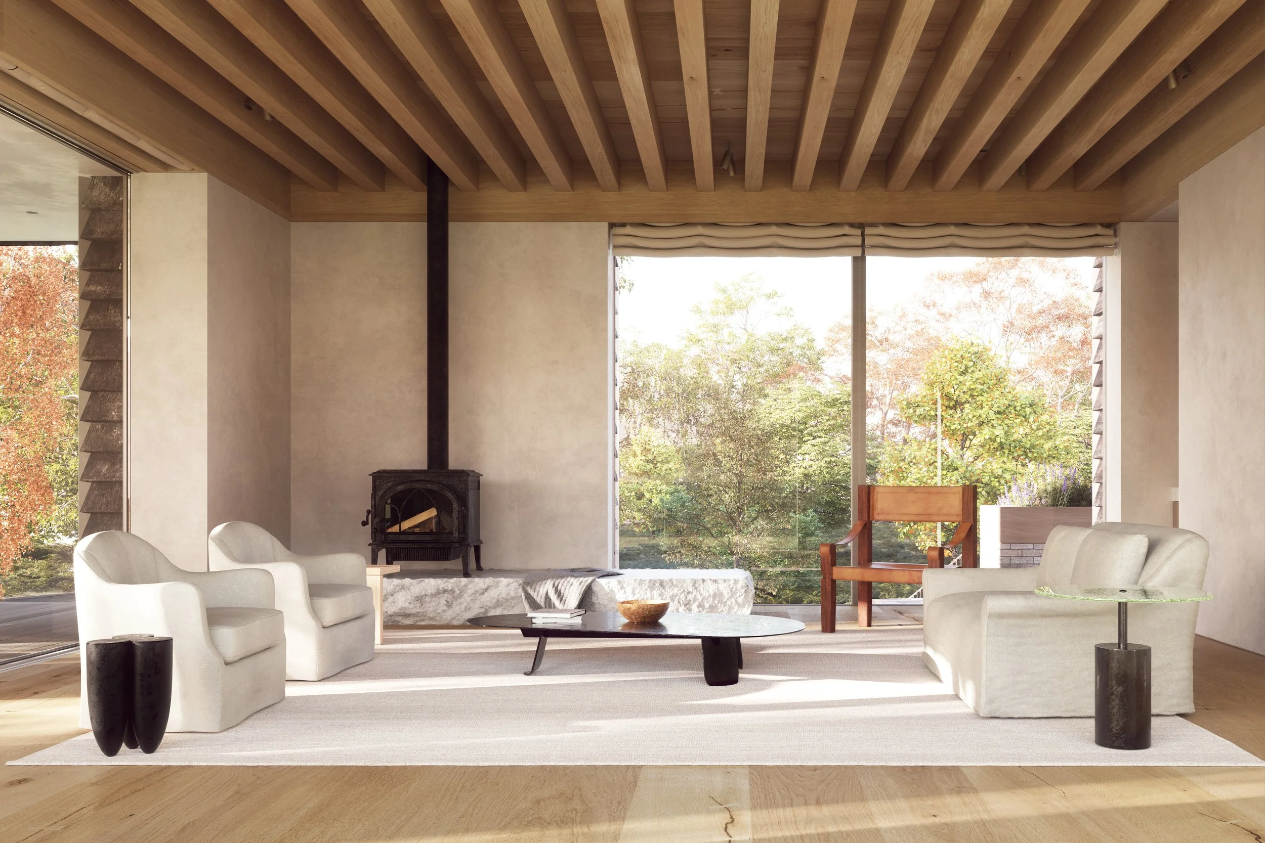 Raw Lime Plaster Walls: A breathable, all-natural plaster that softens light, absorbs sound, and evolves with time, creating a living finish unique to this home.